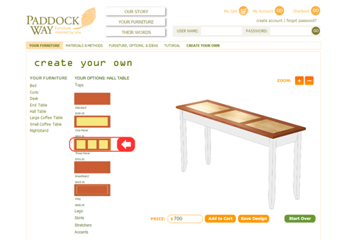 Sure, you may say to yourself, this sounds interesting, but how is it useful? Unlike other online purchases, online furniture buying is not an impulse buy. Furniture shoppers base their decisions on price, on look, on practicability, even on dimentions, and they take time to review purchases again and again. The question facing Paddock Way was how to engage the visitors and stand out from all other online furniture stores while doing so. A secondary objective was to capture the user’s imagination and their time by allowing them to conduct comparison shopping right on the site itself (rather than visiting other sites) due to the tool’s inherent ability to allow users to compare thousands of possible dreams.